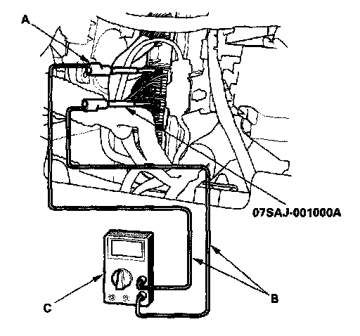 1. Connect the backprobe adapters (A) to the stacking patch cords (B), and connect the cords to a digital multimeter (C),