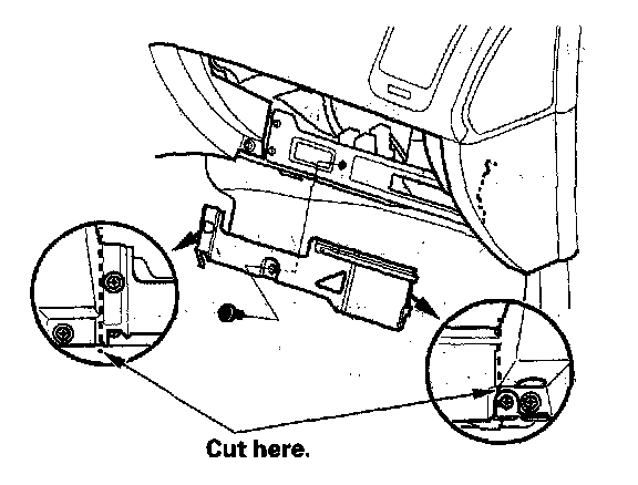 5. Remove the bolt. Cut the plastic cross brace in the glove box opening with diagonal cutters in the area shown, and discard it.