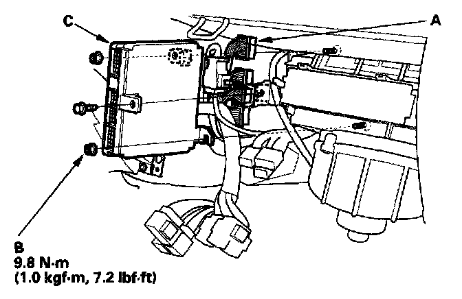 8. Remove the nuts(B), then remove the ECM (C).