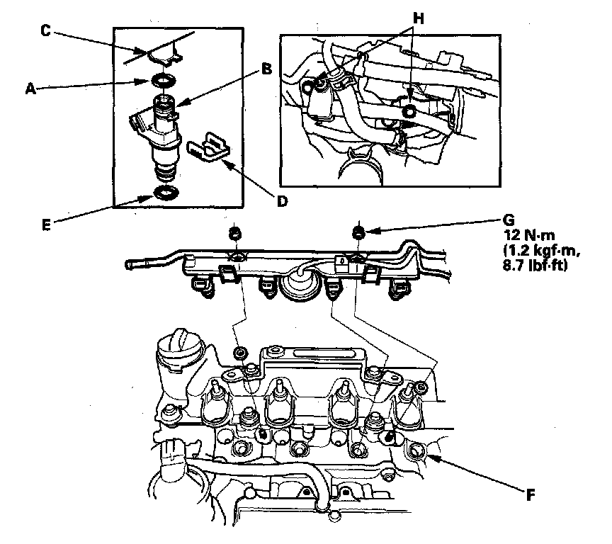 9. Remove the fuel rail mounting nuts (F) from the fuel rail, then remove the injectors and fuel rail together.