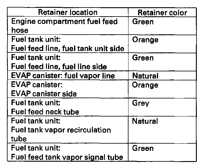 The fuel line/quick-connect fittings connect the fuel line (A) to fuel feed hose (B), the fuel feed hose (C) to the fuel tank unit (D), fuel fill neck tube (G), fuel tank vapor signal tube (H), fuel tank vapor recirculation tube (I) to the fuel tank and the purge hose (J) to the EVAP canister (K), purge line (L). When removing or installing the fuel feed hose, fuel tank unit, or fuel tank, it is necessary to disconnect or connect the quick-connect fittings.