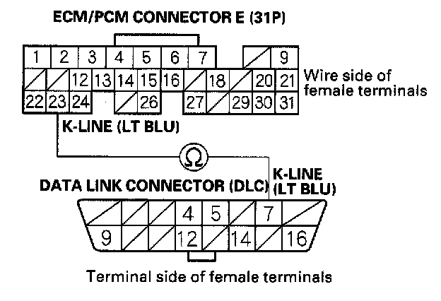 NO - Repair open in the wire between DLC terminal, No. 7 and the ECM/PCM (E23). After repairing the wire, check the DTC with the HDS or a scan tool and go to the indicated DTC's Troubleshooting.
