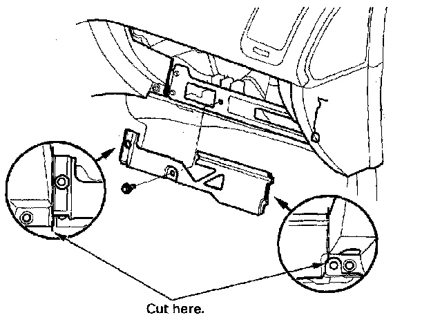 3. Remove the bolt. Cut the plastic cross brace in the glove box opening with diagonal cutters in the area shown, and discard it.