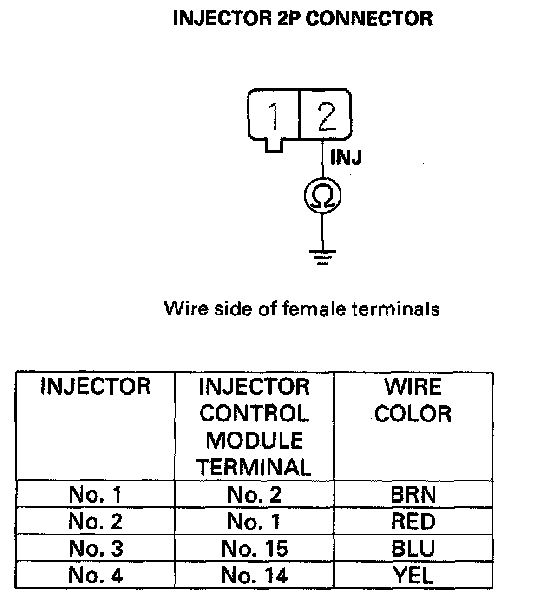 3. Check for continuity between each injectors control module terminal and body ground (see table).