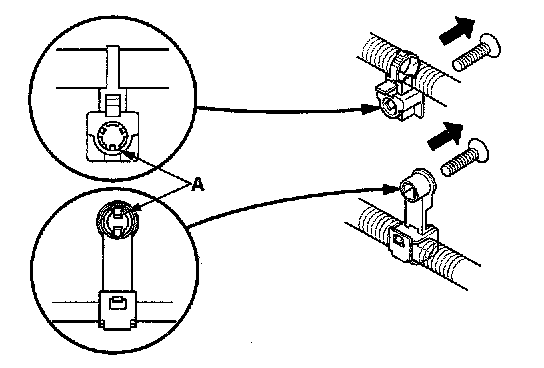 - Slip pliers (A) under the clip base and through the hole at an angle, then squeeze the expansion tabs to release the clip.