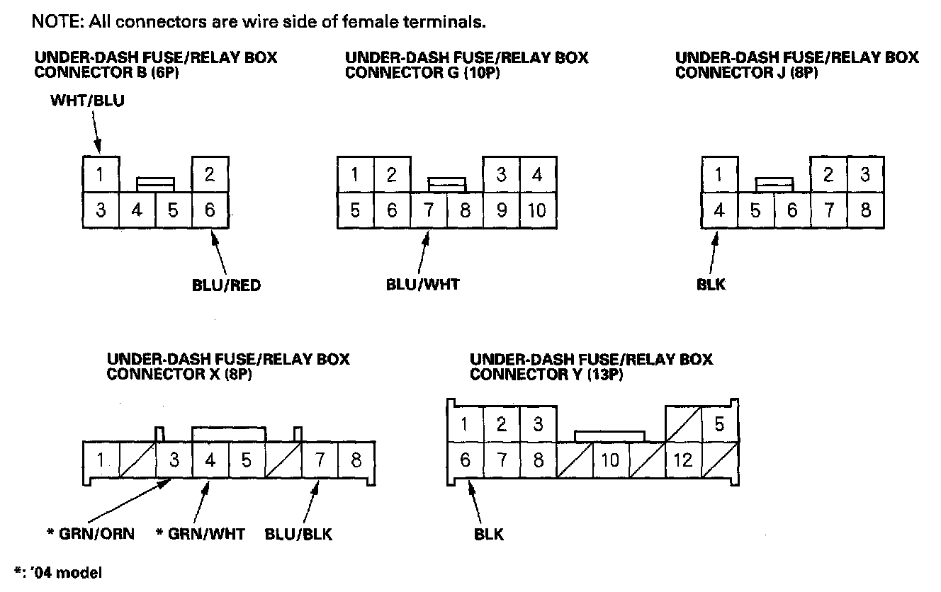 6. Disconnect the X connector from the under-dash fuse/relay box, and make these input tests at the connector. If this input test proves OK, the multiplex control unit must be faulty; replace the under-dash fuse/relay box assembly.