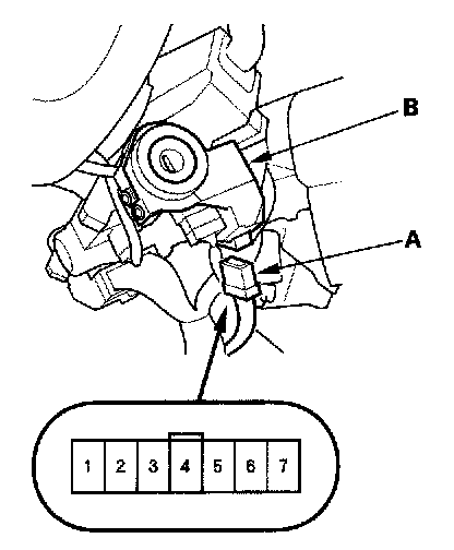 5. Disconnect the 7P connector (A) from the immobilizer control unit-receiver (B).