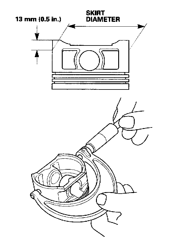 3. Measure the piston diameter at a point 13 mm (0.5 inch) from the bottom of the skirt.