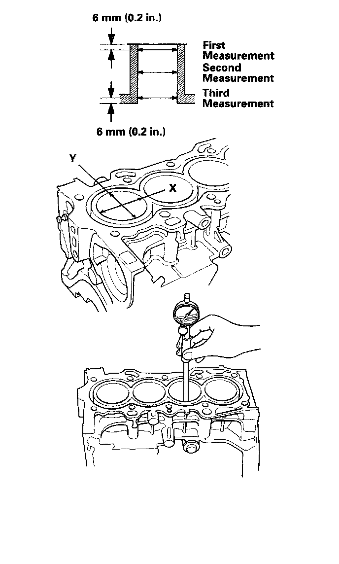 4. Measure wear and taper in direction X and Y at three levels in each cylinder as shown. If measurements in any cylinder are beyond the Oversize Bore Service Limit, replace the block. If the block is to be rebored, refer to step 6 after reboring.