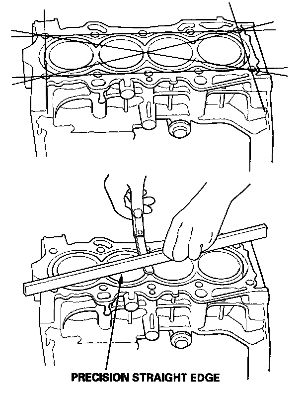 6. Check the top of the block for warpage. Measure along the edges and across the center as shown.