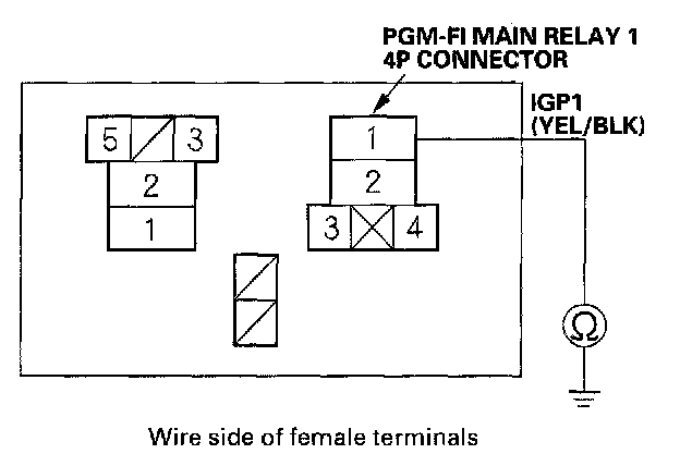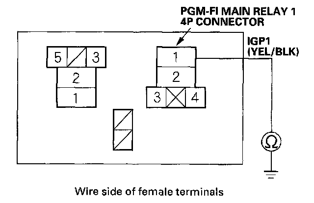 18. Check for continuity between body ground and PGM-FI main relay 1 4P connector terminals No. 2 and No. 4 individually.