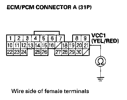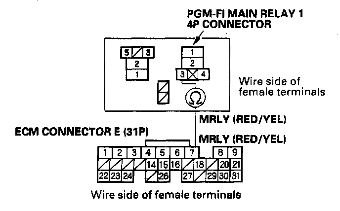 21. Check for continuity between PGM-FI main relay 1 4P connector terminal No. 1 and body ground.