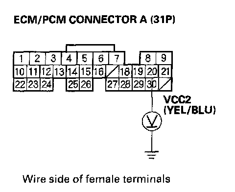 44. Measure voltage between body ground and ECM/PCM connector terminals A2 and A3 individually.