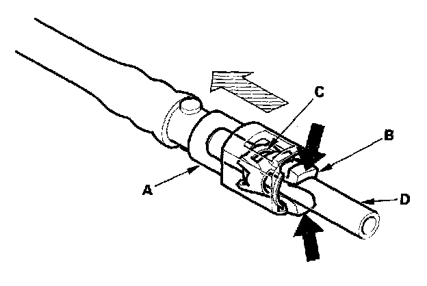 3. Place a rag or shoptowel over the quick-connect fitting. Hold the connector (A) with one hand, and squeeze the retainer tabs (B) with the other hand to release the tabs from the locking tabs (0. Pull the connector off.