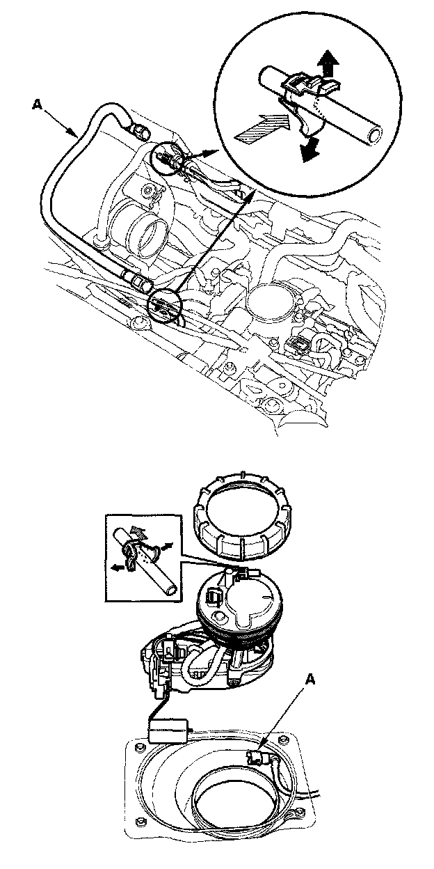 3. Before connecting a new fuel line/quick-connect fitting assembly (A), remove the old retainer from the mating line.