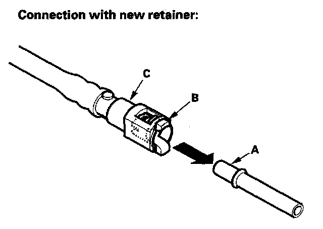 4. Align the quick-connect fittings with the line (A), and align the retainer locking tabs (B) with the connector tabs (C). Then press the quick-connect fittings onto the line until both retainer pawls lock with a clicking sound.