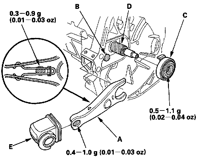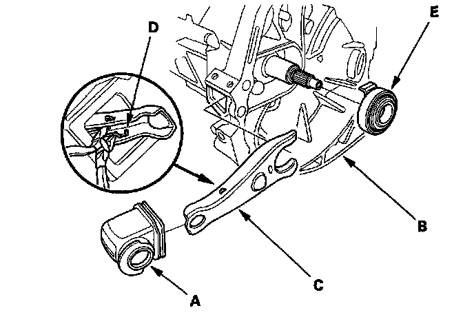 2. Remove the release fork (C) from the clutch housing (B) by squeezing the release fork set spring (D) with pliers. Remove the release bearing (E).