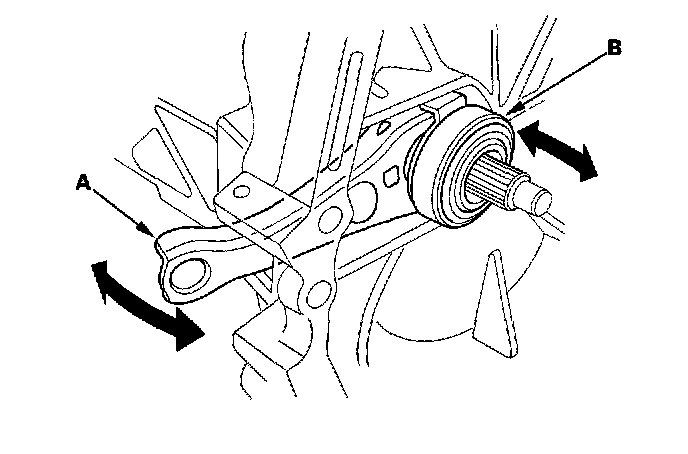 8. Move the release fork (A) right and left to make sure that it fits properly against the release bearing (B), and that the release bearing slides smoothly.