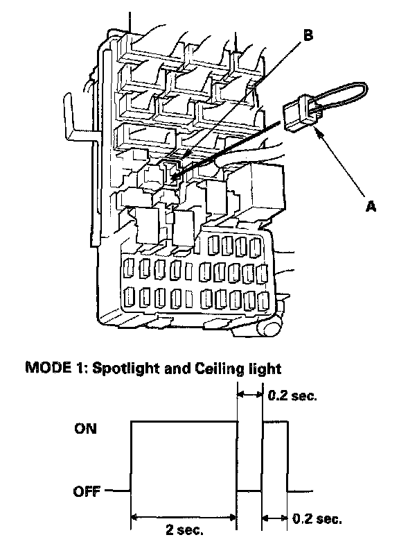 8. If the DTCs are present, the spotlight and ceiling light will blink to indicate the DTC(s). If more than one DTC is present, the DTCs will be displayed in ascending order. If there are no DTCs the spotlight and ceiling light will not blink again after the Mode 1 indication.
