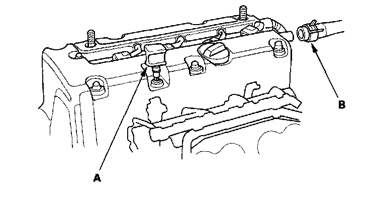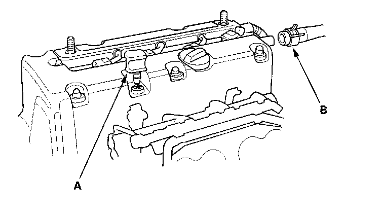8. Install the dipstick (A) and breather hose (B).