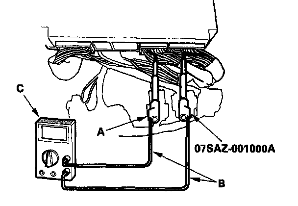 1. Connect the backprobe adapters (A) to the stacking patch cords (B), and connect the cords to a digital multimeter (C).