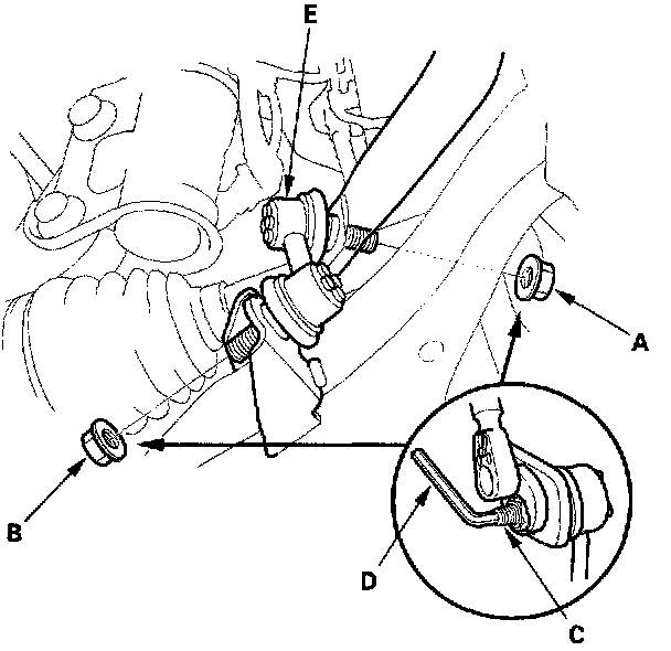 2. Remove the self-locking nut (A) and flange nut (B) while holding the respective joint pin (C) with a hex wrench (D), and remove the stabilizer link (E).