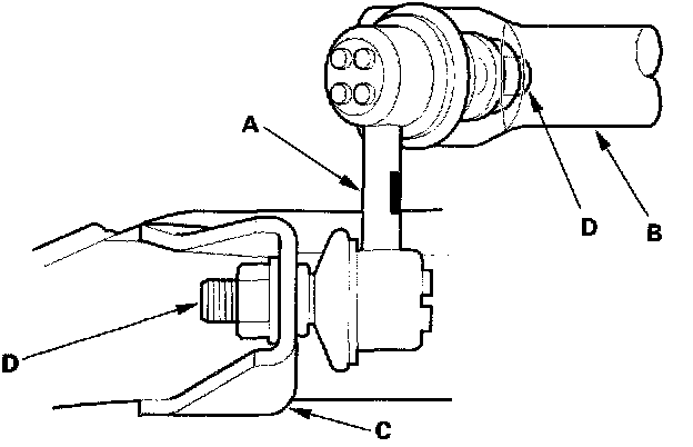 3. Install the stabilizer link (A) on the stabilizer bar (B) and lower arm (C) with the joint pins (D) set at the center of their range of movement.