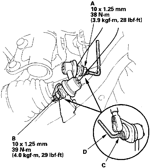 6. Tighten the self-locking nut (A) and flange nut (B) to the specified torque values while holding the respective joint pins (C) with a hex wrench (D).