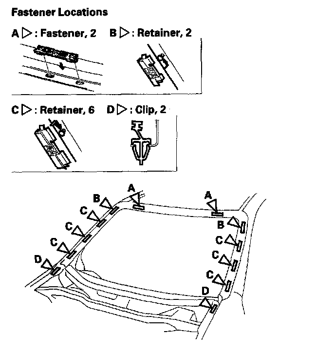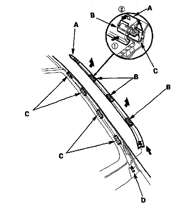 2. Pull up the side trim (A) to release the clips (B) from the retainers (C), and pull the trim rearward to release it from the clip (D) then remove the trim from each side of the windshield.