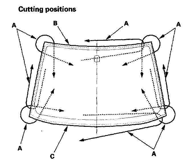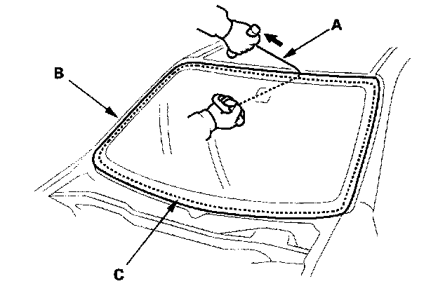 8. With a helper on the outside, pull the piano wire (A) back and forth in a sawing motion. Hold the piano wire as close to the windshield (B) as possible to prevent damage to the body and dashboard. Carefully cut through the rubber dam and adhesive (C) around the entire windshield.