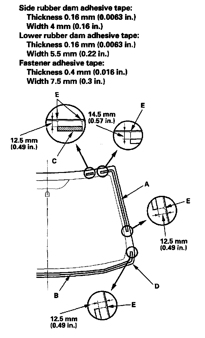 13. Attach the side rubber dams (A), lower rubber dam(B), and fasteners (C) with adhesive tape to the inside face of the windshield (D) as shown: