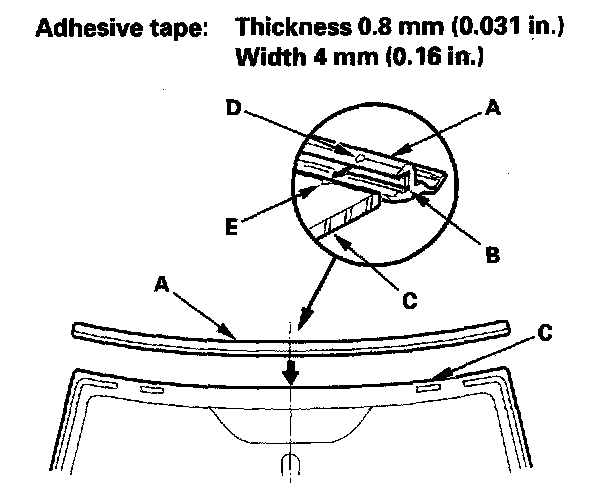 - Be sure the alignment mark (D) of the molding lines up with the alignment mark (E) of the windshield.