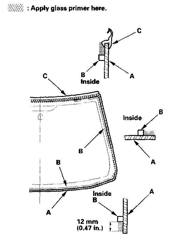 18. With a sponge, apply a light coat of glass primer around the edge of the windshield (A) between the dams (B) and molding (C) as shown, then lightly wipe it off with gauze or cheesecloth: