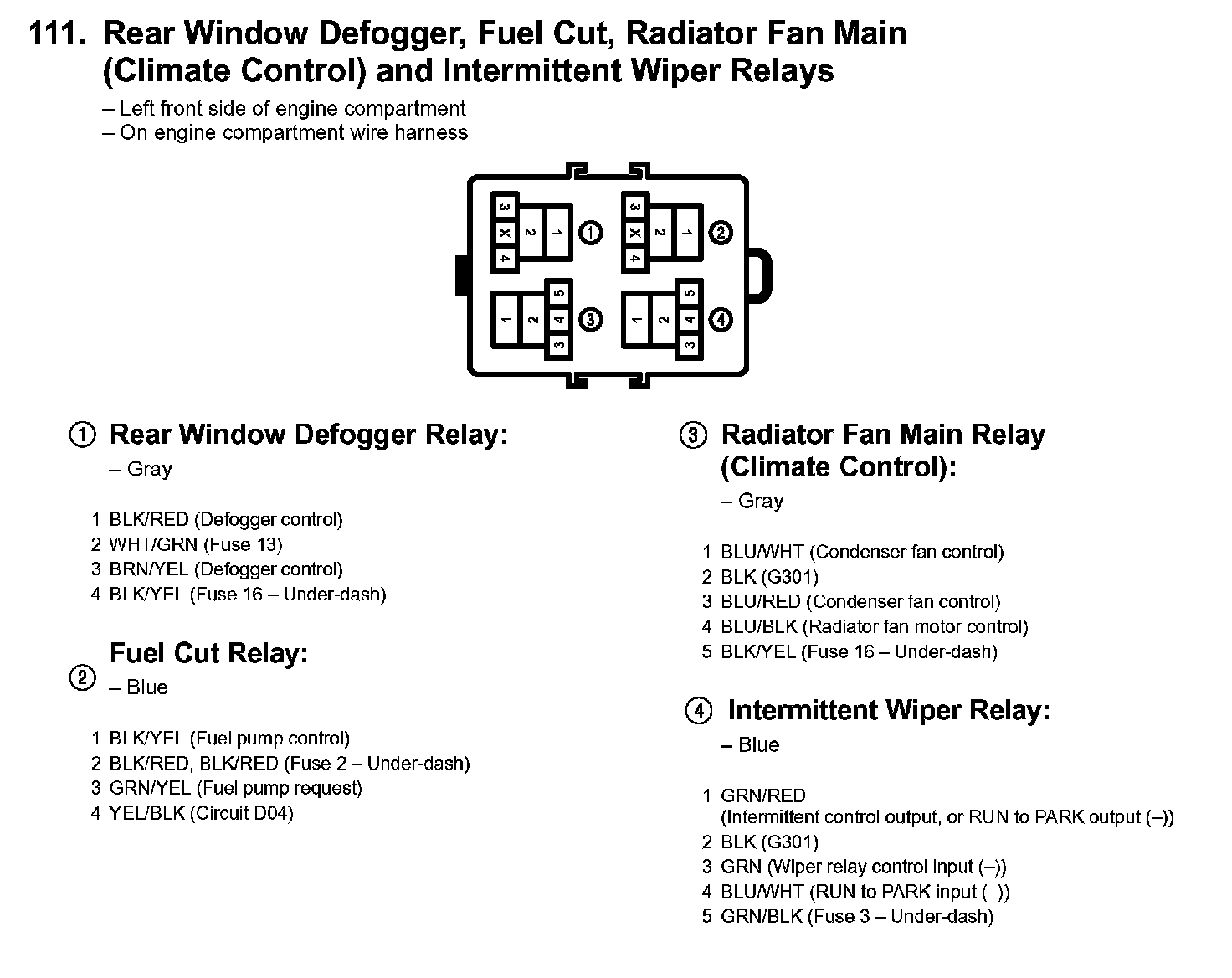 111. Rear Window Defogger, Fuel Cut, Radiator Fan Main (Climate Control) And Intermittent Wiper Relays: