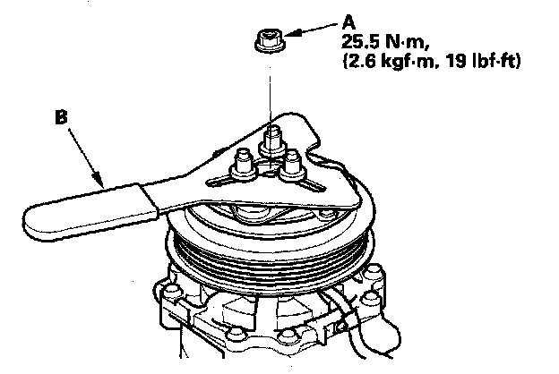1. Remove the center nut (A) while holding the armature plate with the commercially available A/C clutch holder (B).