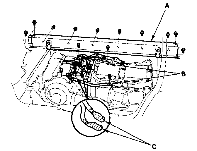 13. Disconnect the connector (A) from the rear of the cooling fan assembly (B), and remove the harness clip from the fan shroud (C).