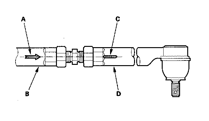 3. Loosen the inner locknut (A) while holding the tie-rod arm (B), and loosen the outer locknut (C) while holding the tie-rod end (D).