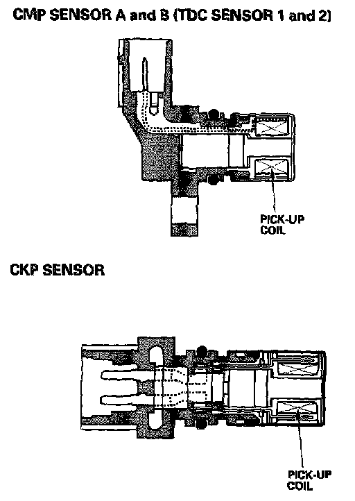 The CMP A (TDC 1) and CMP B (TDC 2) sensors detect the position of the No. 1 cylinder as a reference for sequential fuel injection to each cylinder. The CKP sensor detects engine speed and is used as one input to determine ignition timing and timing for fuel injection of each cylinder.