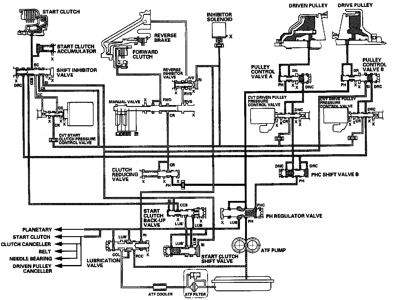 Fluid from the ATF pump is regulated to high pressure at the PH regulator valve, and flows to the pulley control valves. The CVT driven pulley pressure control valve and the CVT drive pulley pressure control valve control the pulley control valves A and B to apply pressure to the pulleys. The driven pulley receives pressure higher than pressure drive pulley receives, but hydraulic pressure to the forward clutch is intercepted by the manual valve and to the start clutch is intercepted by the CVT start clutch pressure control valve. Under this condition, hydraulic pressure is not applied to the start and forward clutches.