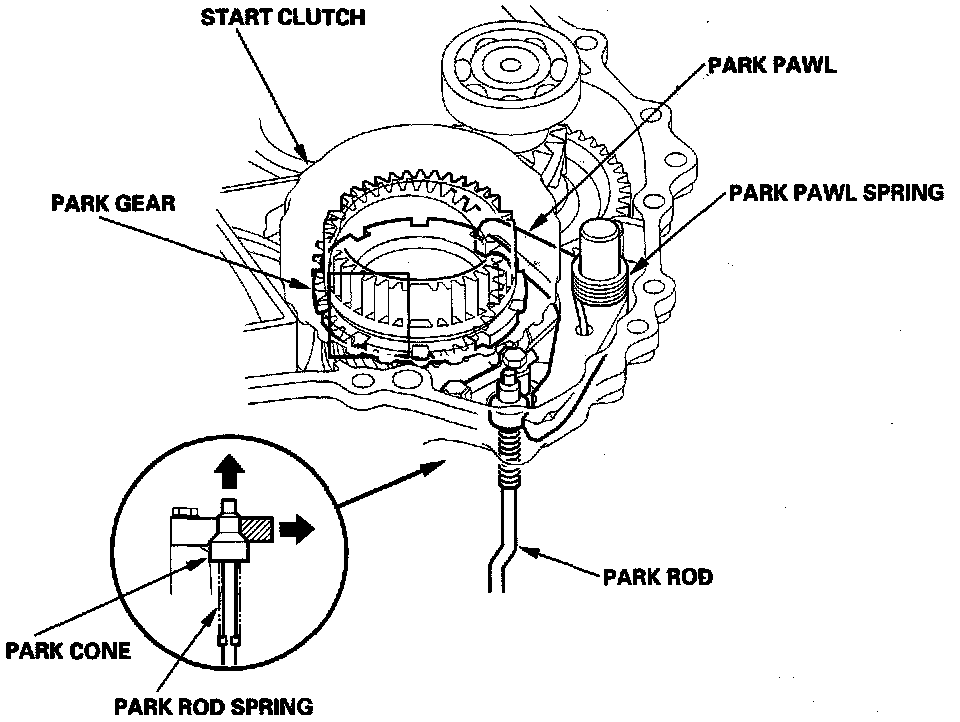 Shifting to the [P] position causes the park cone (installed at the end of the park rod) to press the park pawl onto the park gear. Even if the end of the park pawl rides on the top of the park gear teeth, slight movement of the vehicle will cause the park pawl and park gear to mesh with each other completely because the park cone receives the tension from the park rod spring. The park pawl receives the tension (which acts to separate the park pawl from the park gear) from the park pawl spring.