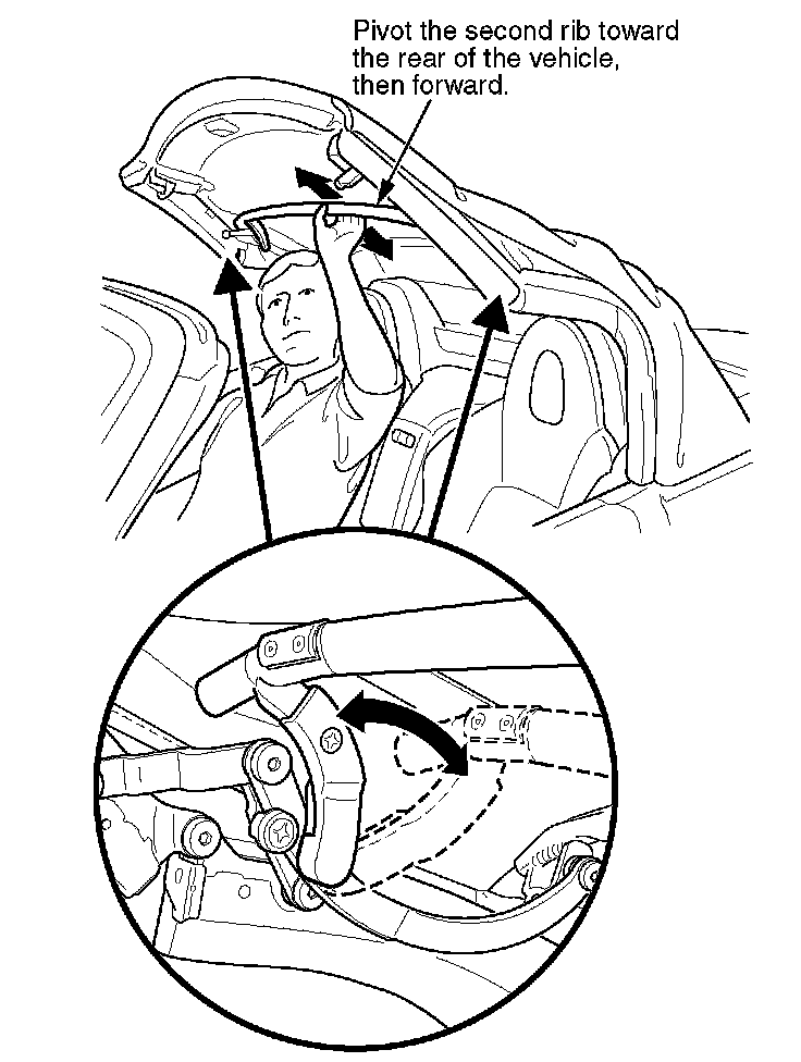 2. Grasp the second rib of the convertible top and pivot the second rib toward the rear of the vehicle, then forward again.