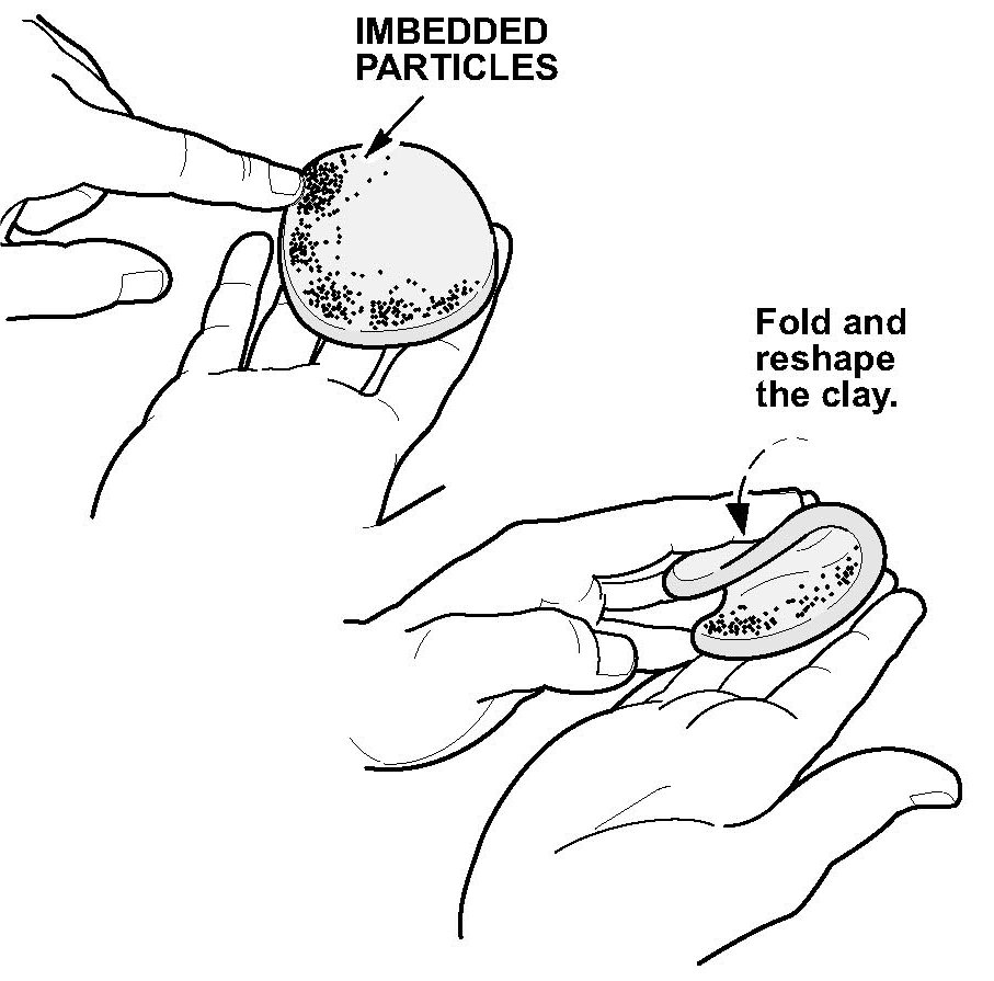 ^ If you feel any particles on the cleaned surface fold the clay in half, knead it back into a disk shape, clean the section again, and recheck your work.