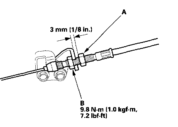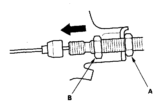 6. Pull the cable so that the adjusting nut (A) touches the bracket, and tighten the lockout (B).