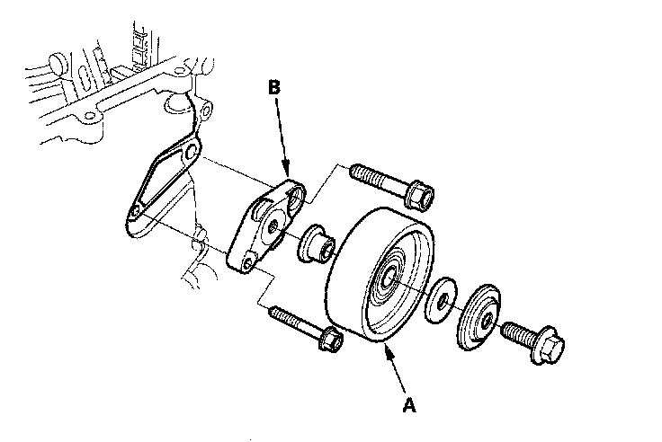 13. Remove the idler pulley (A), then remove the idler pulley base (B).