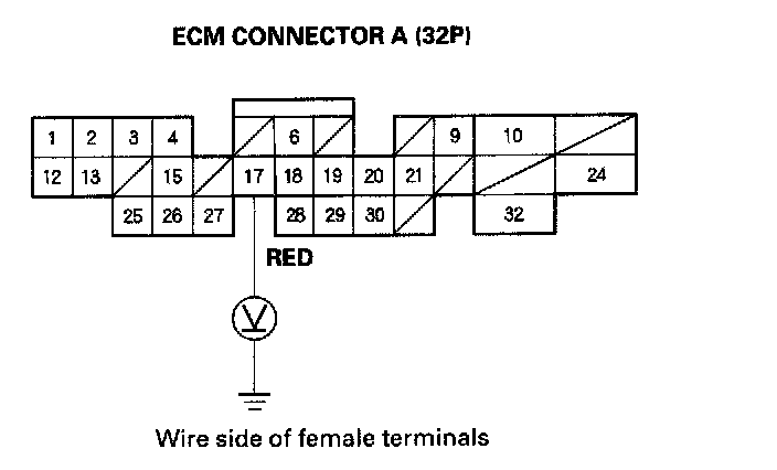 13. Using a backprobe set, measure the voltage between the No.17 terminal of ECM connector A (32P) and body ground with the ECM connectors connected.