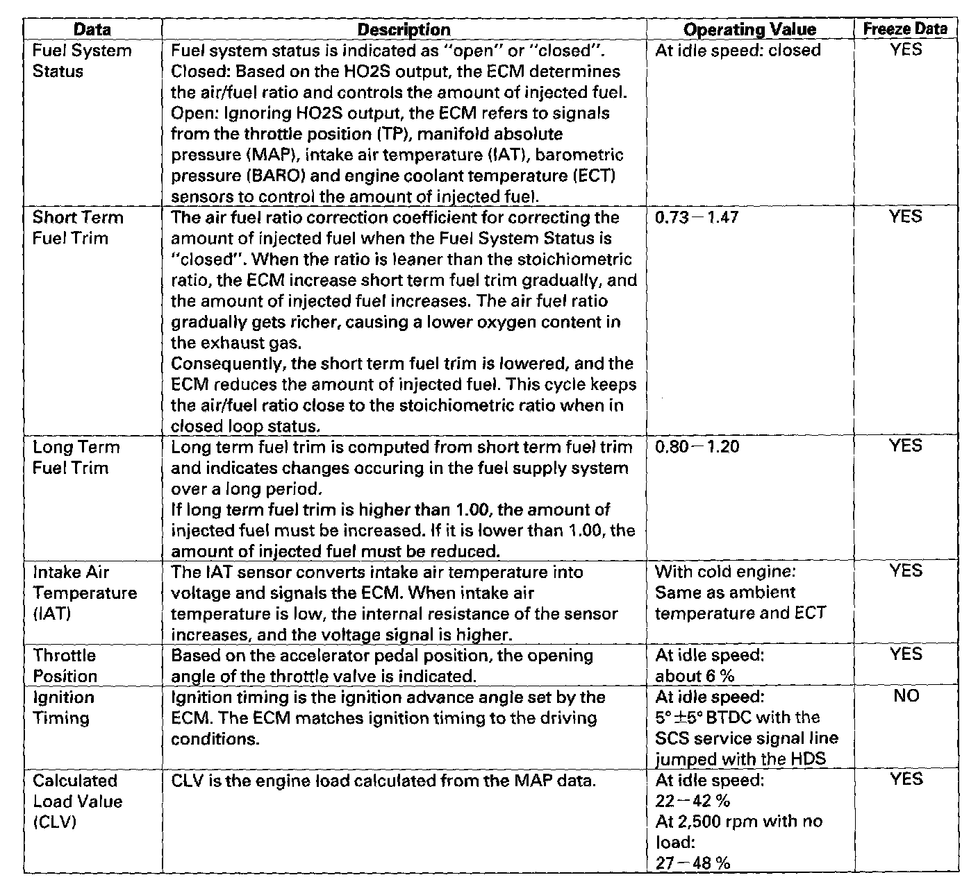 NOTE: The "operating values" listed are approximate and may vary depending on the environment and the individual vehicle. Unless noted otherwise, "at idle speed" means idling with the engine completely warmed up, in neutral position, and the A/C and all accessories turned off.