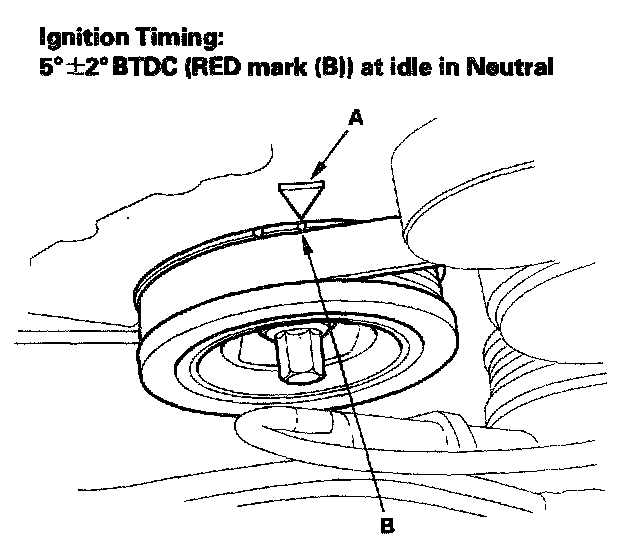 6. Aim the light toward the pointer (A). Check the ignition timing under no load conditions: