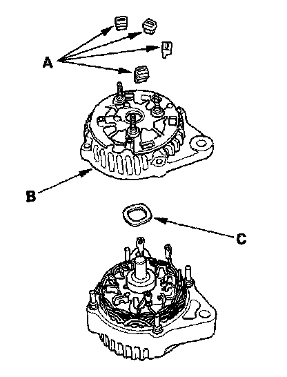 8. Remove the four screws (A), then remove the rectifier (B) and rubber seal (C).