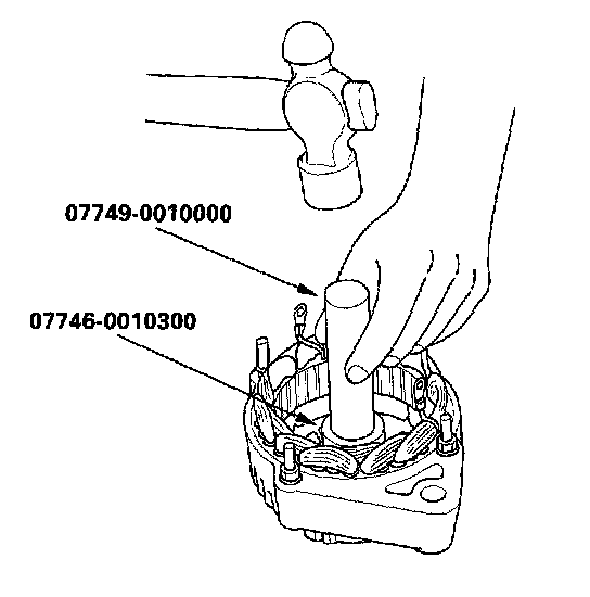 17. With a hammer and the special tools, install a new front bearing in the stator housing.