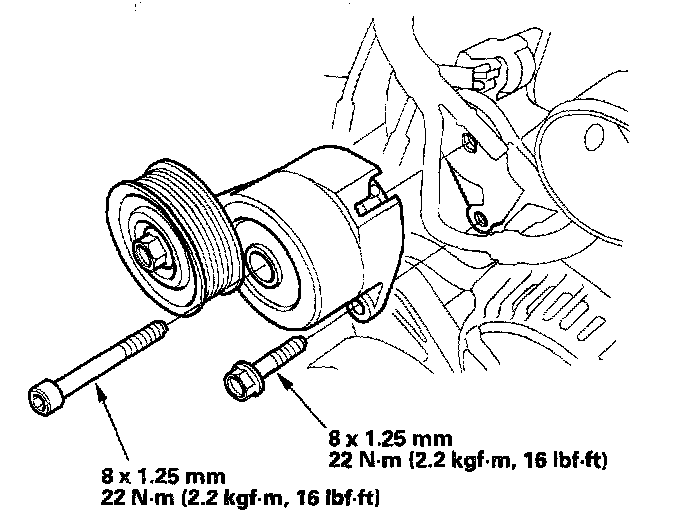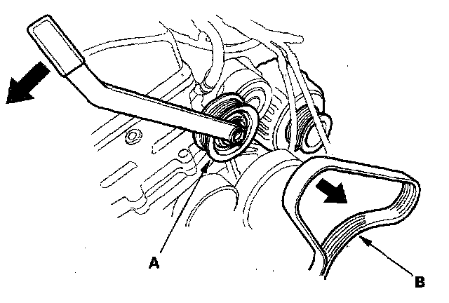 3. Move the auto-tensioner (A) to relieve tension from the alternator-compressor belt, and remove the belt (B).